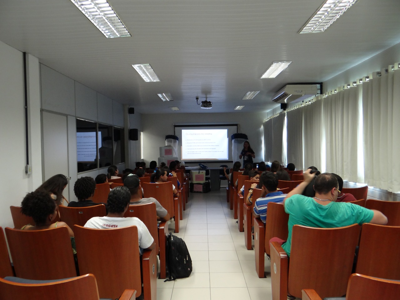 Na primeira foto, se vê um jogo feito com papelão sobre diferenciação de animais a partir de suas características; Nas duas imagens seguintes, um experimento sobre massas de água a partir da salinidade, está sendo feito durante uma palestra.