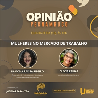 Apresentado por Josimar Parahyba, o programa recebe Ramona Raissa Ribeiro, pesquisadora da Pós-Graduação em Sociologia da Universidade Federal de Pernambuco, e Clécia Farias, consultora de Recursos Humanos. O Opinião vai ao ar a partir das 18h, na Rádio Universitária FM 99,9.